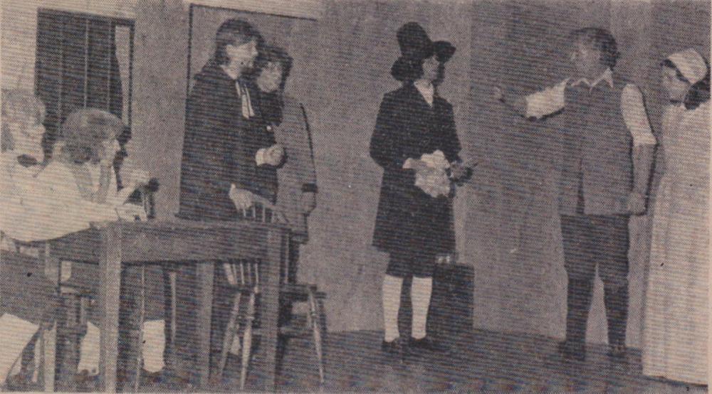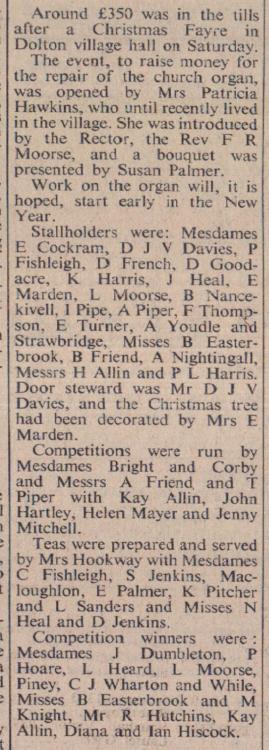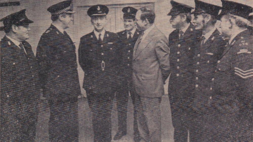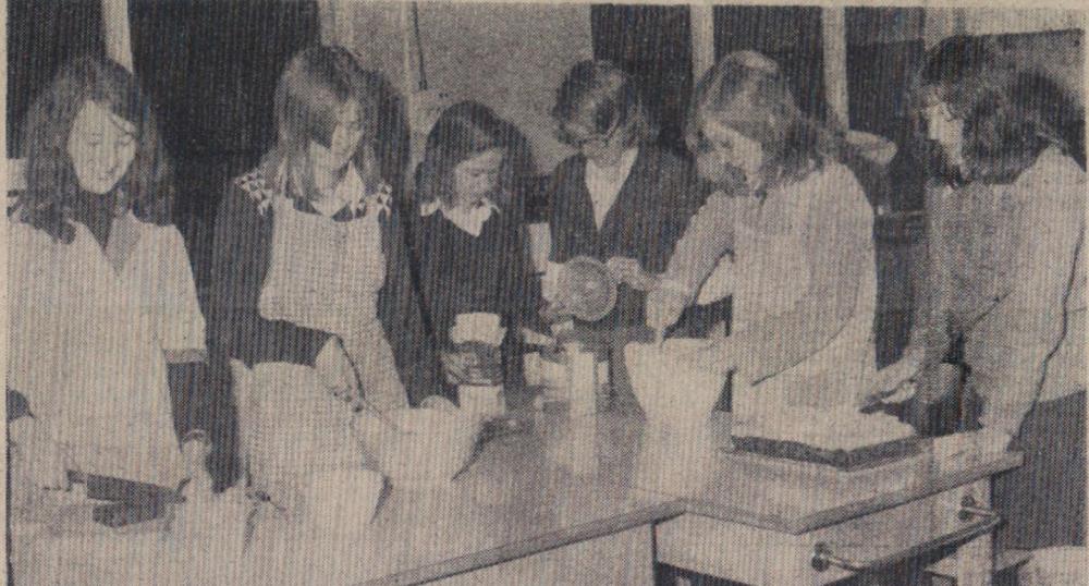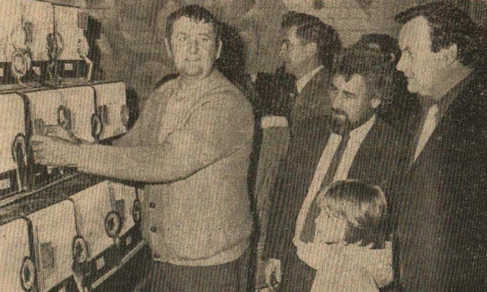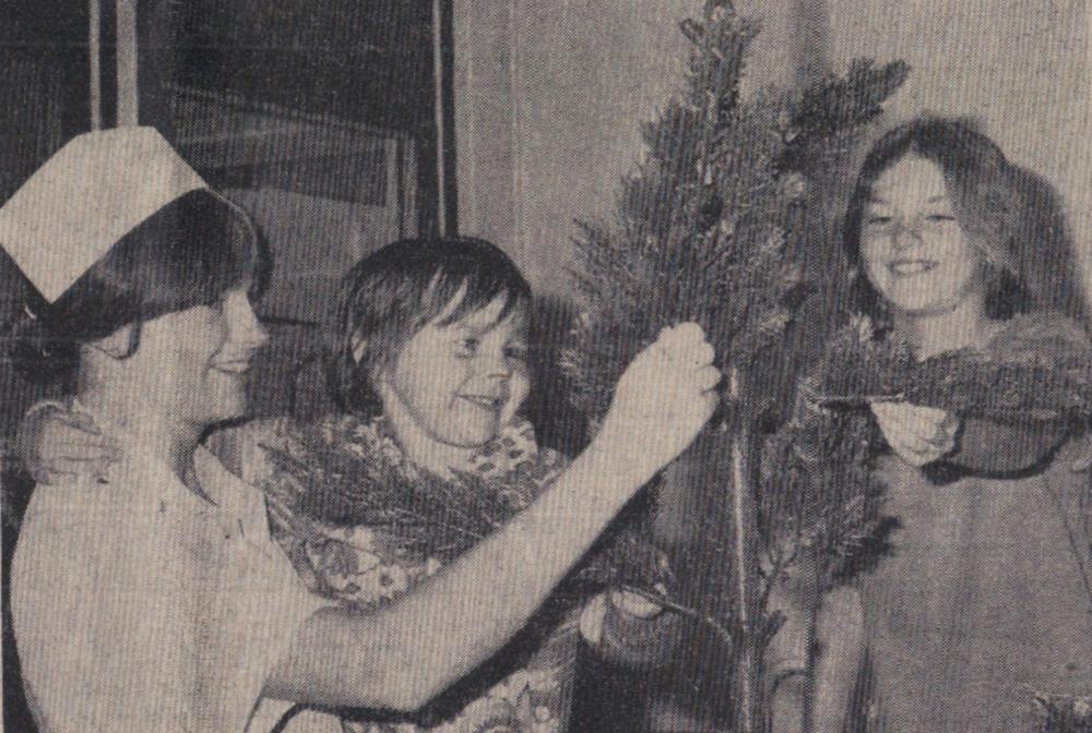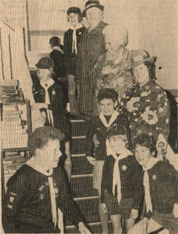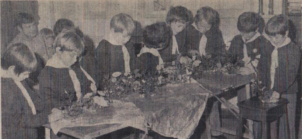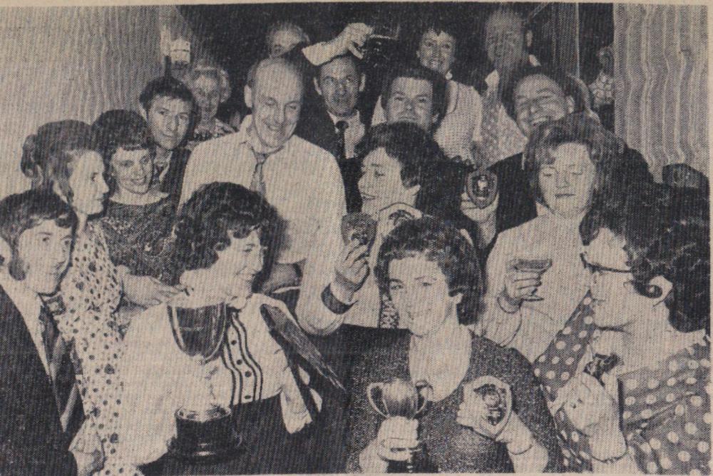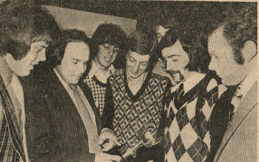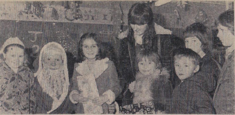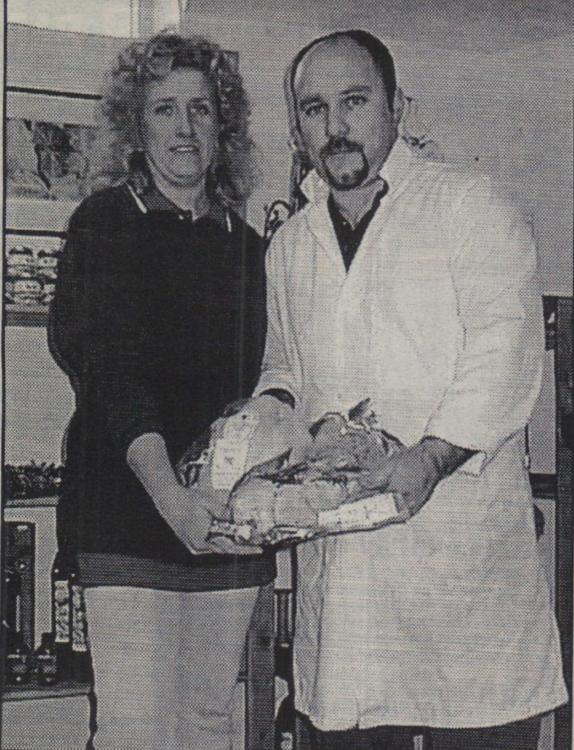 Mr Bill Finn, Gordon Harris, Graham Moore, Mike Harris, Jimmy Harris, Len Daniel, Billy Evans and Roy Drew wait to tuck into a plate of turkey.