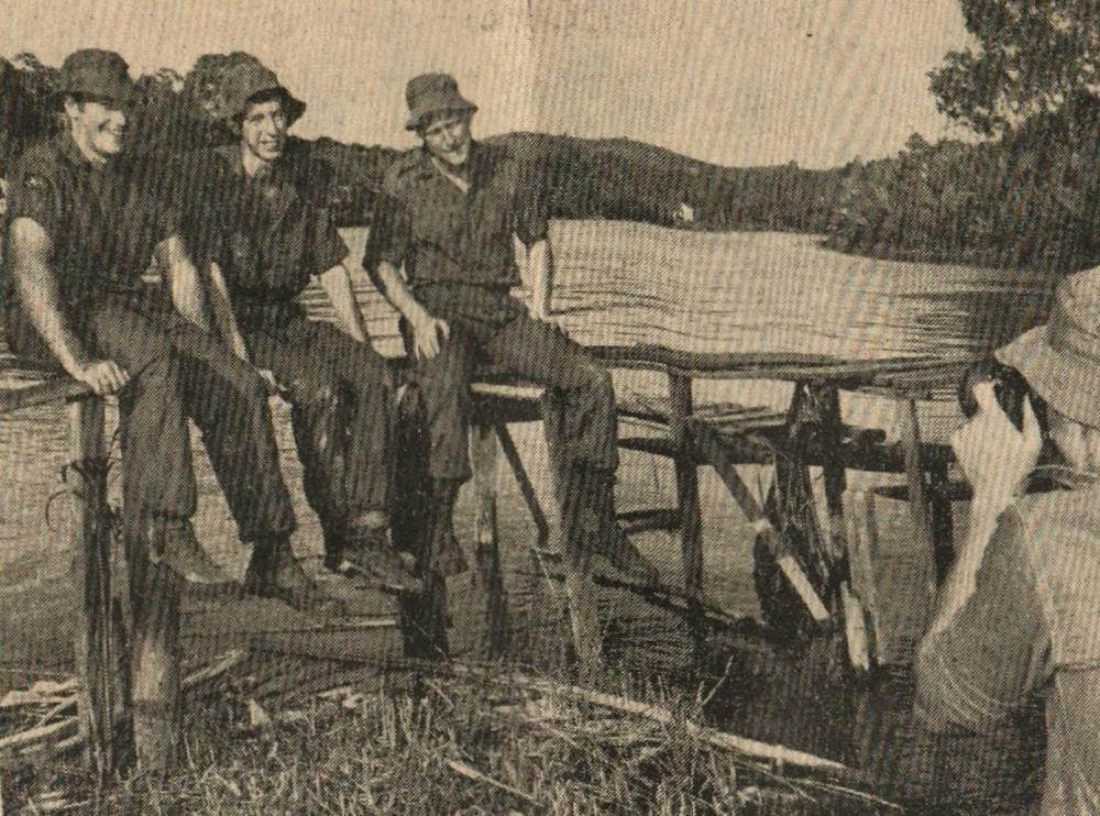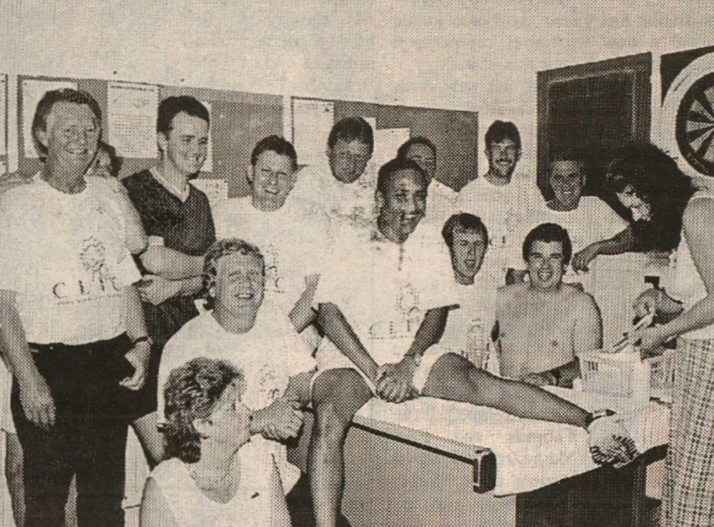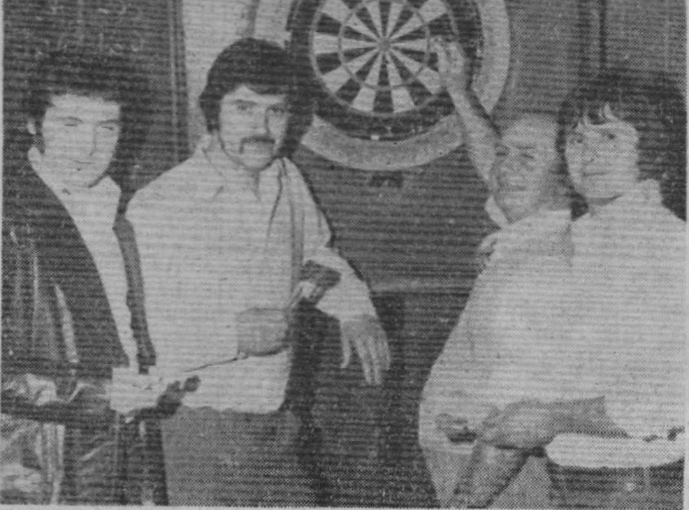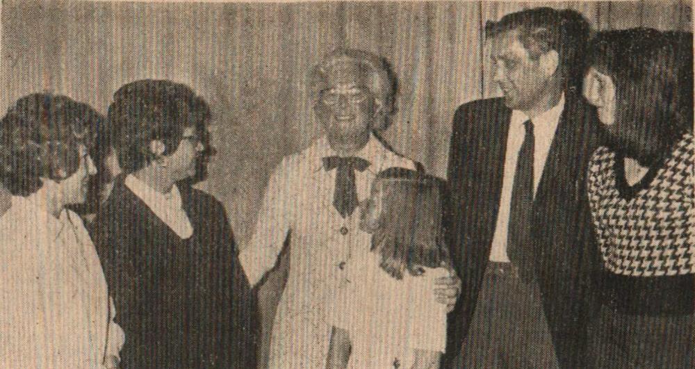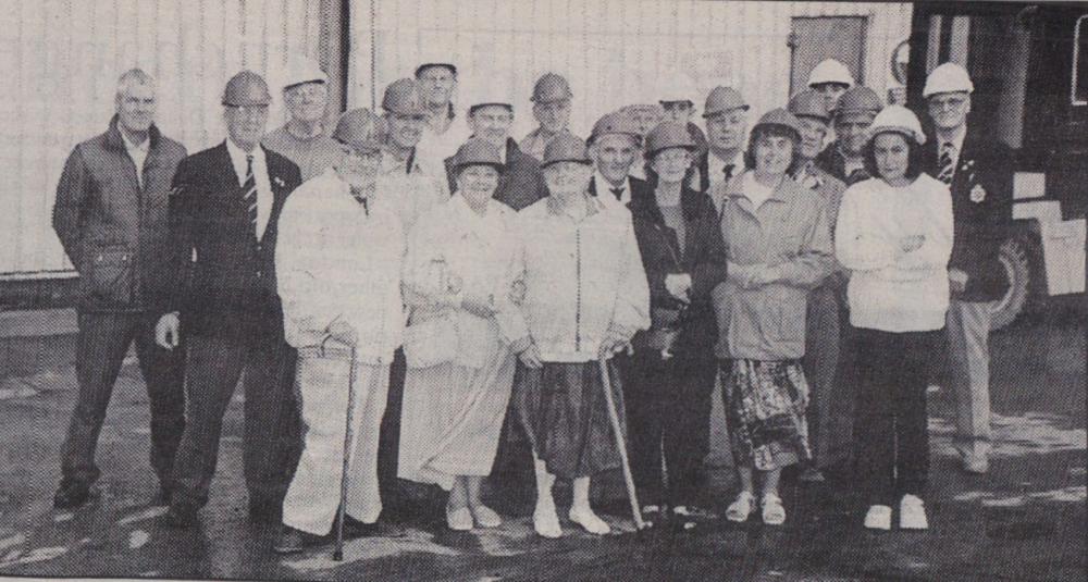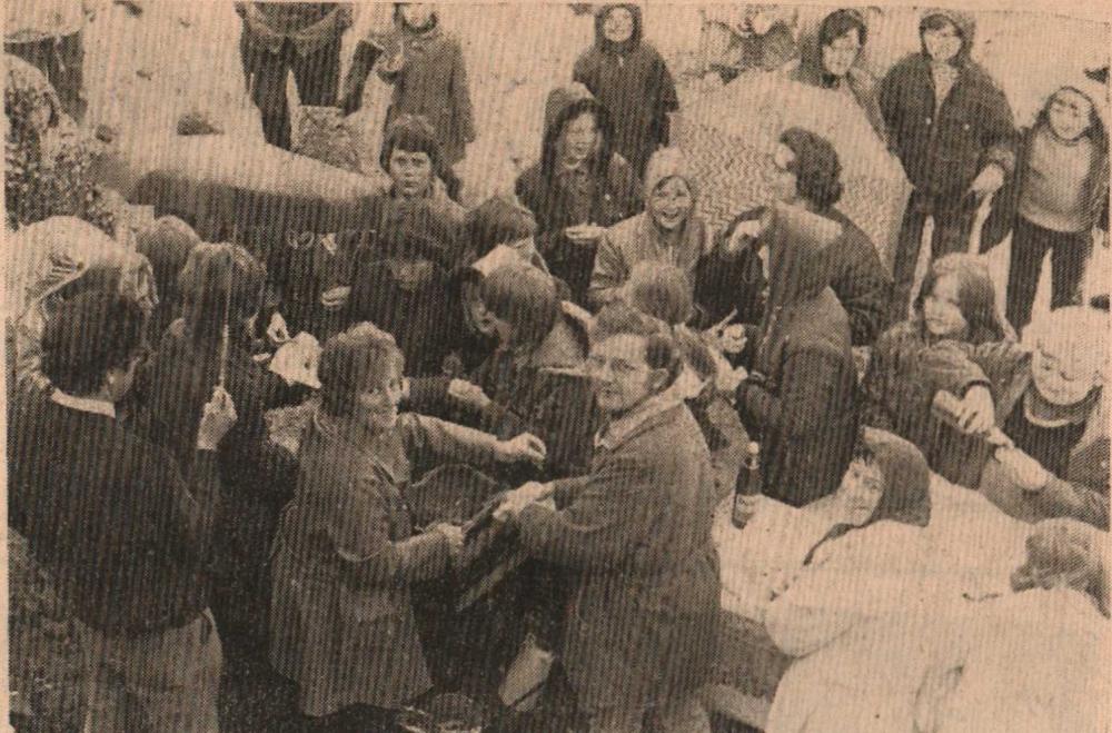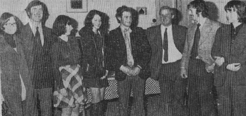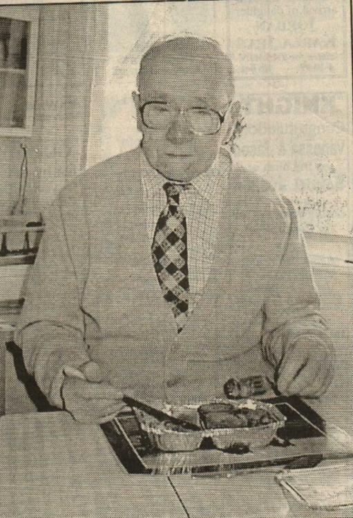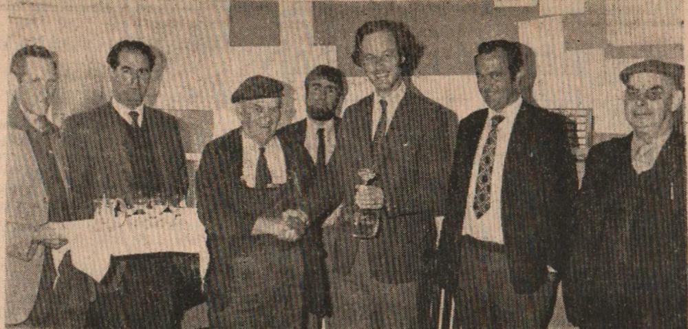 Mr Bill Finn, Gordon Harris, Graham Moore, Mike Harris, Jimmy Harris, Len Daniel, Billy Evans and Roy Drew wait to tuck into a plate of turkey.