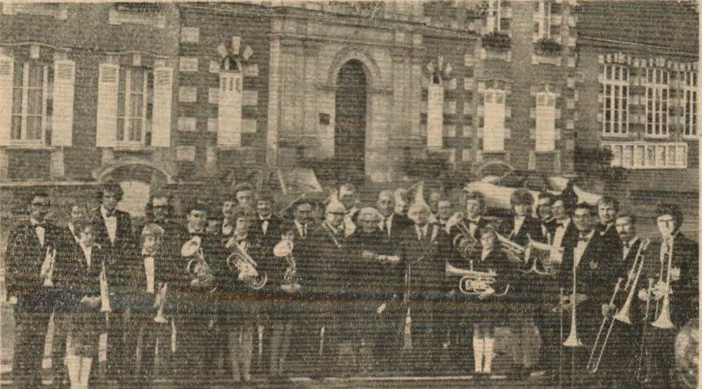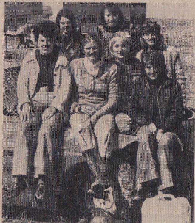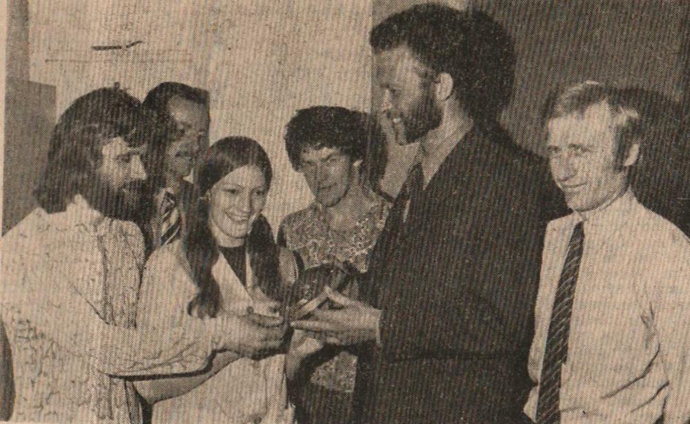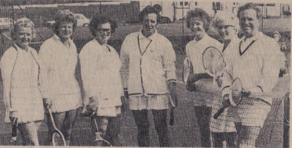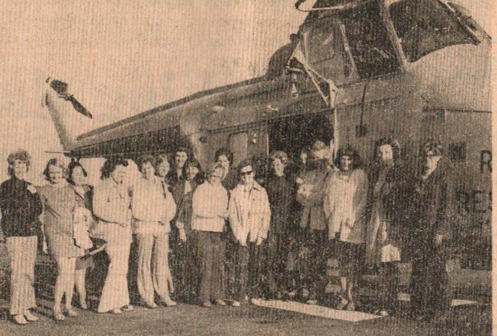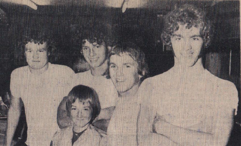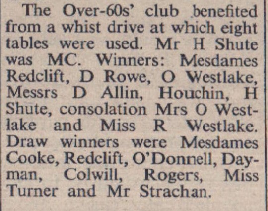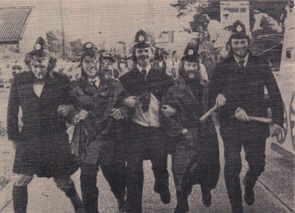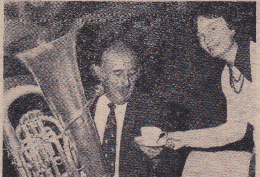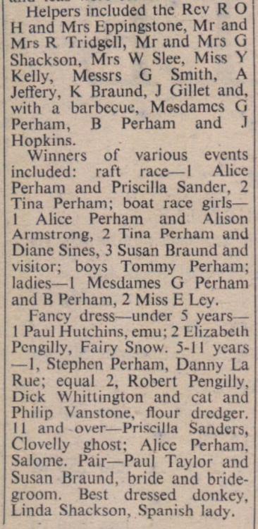 Mr Bill Finn, Gordon Harris, Graham Moore, Mike Harris, Jimmy Harris, Len Daniel, Billy Evans and Roy Drew wait to tuck into a plate of turkey.