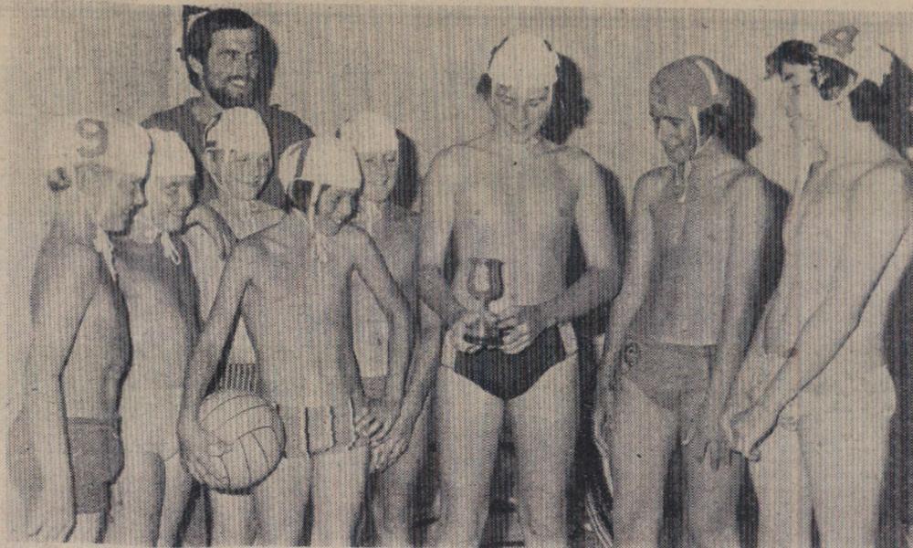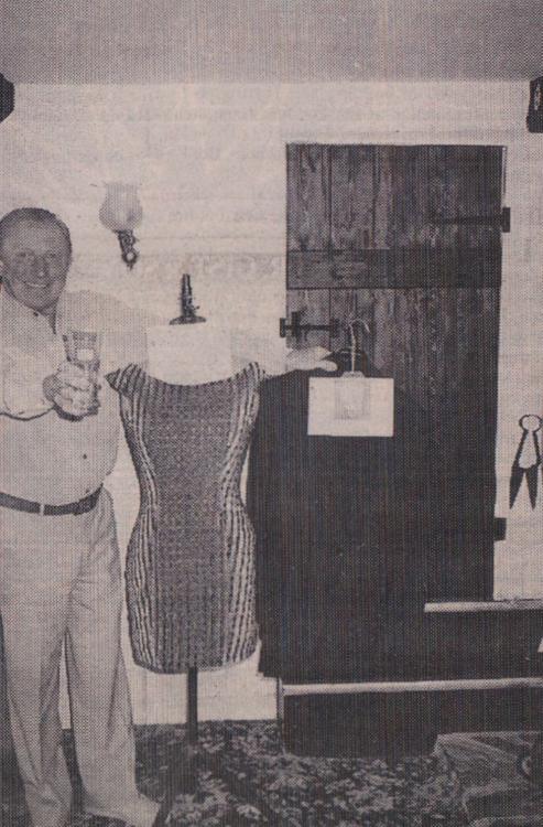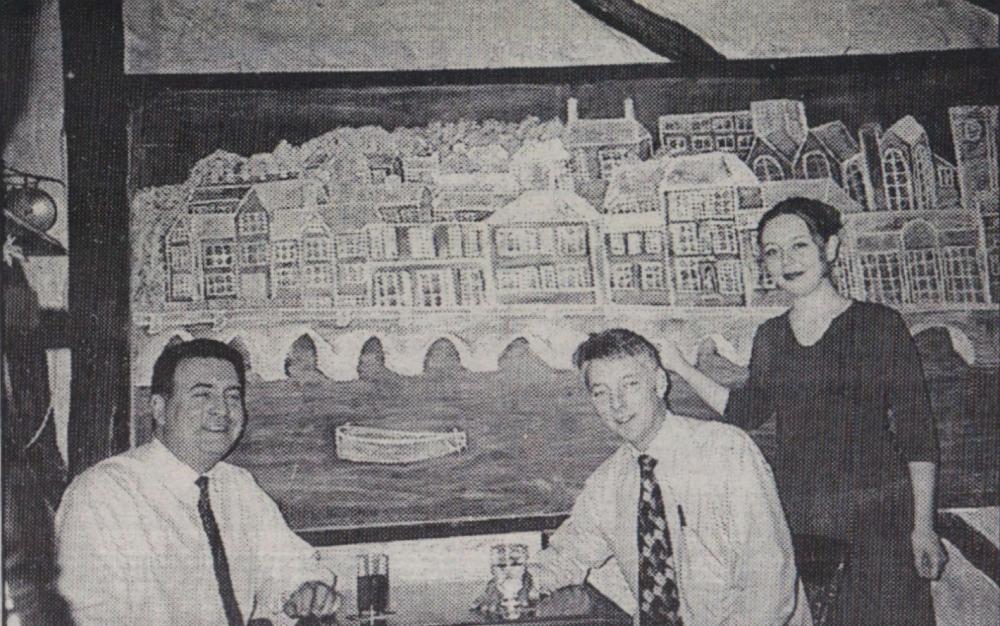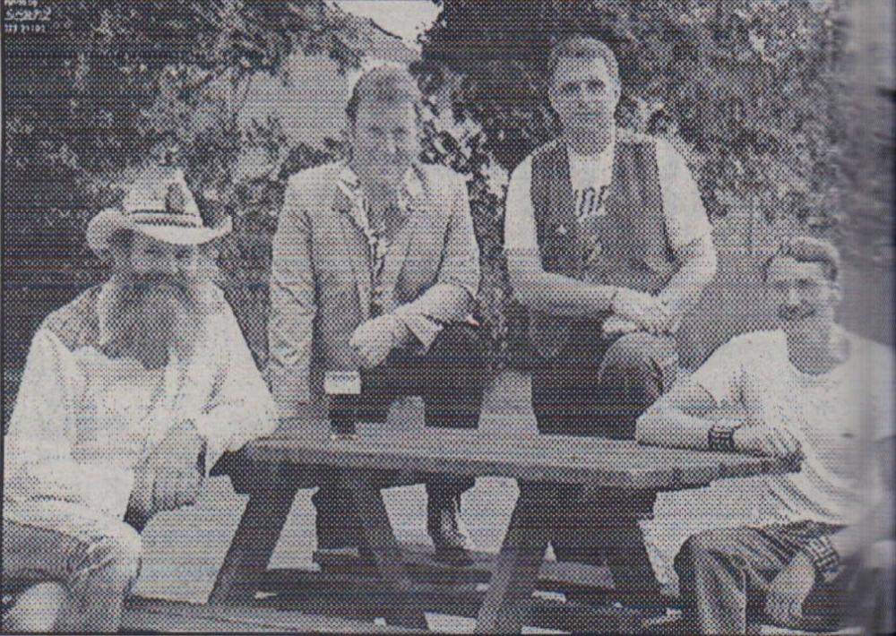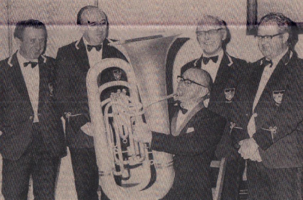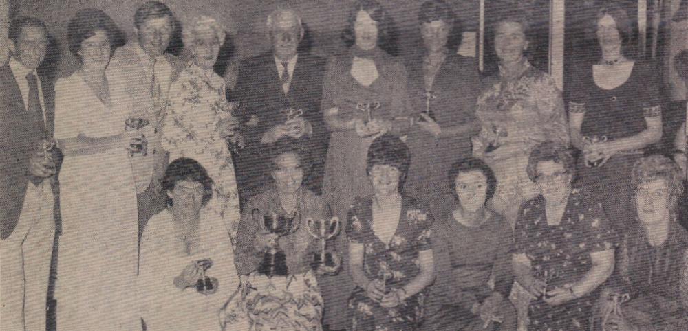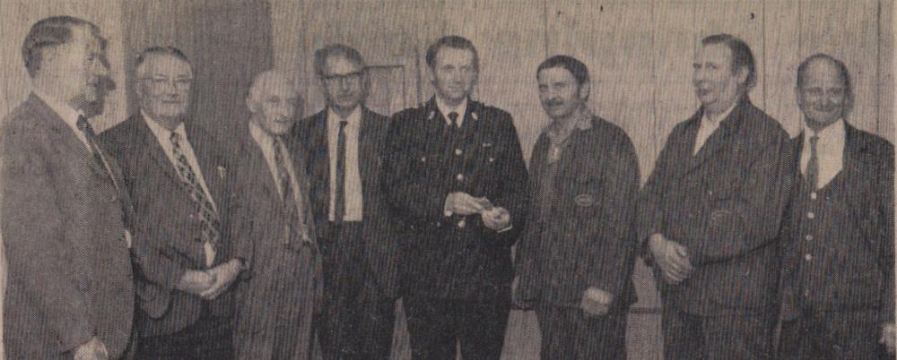 Mr Bill Finn, Gordon Harris, Graham Moore, Mike Harris, Jimmy Harris, Len Daniel, Billy Evans and Roy Drew wait to tuck into a plate of turkey.