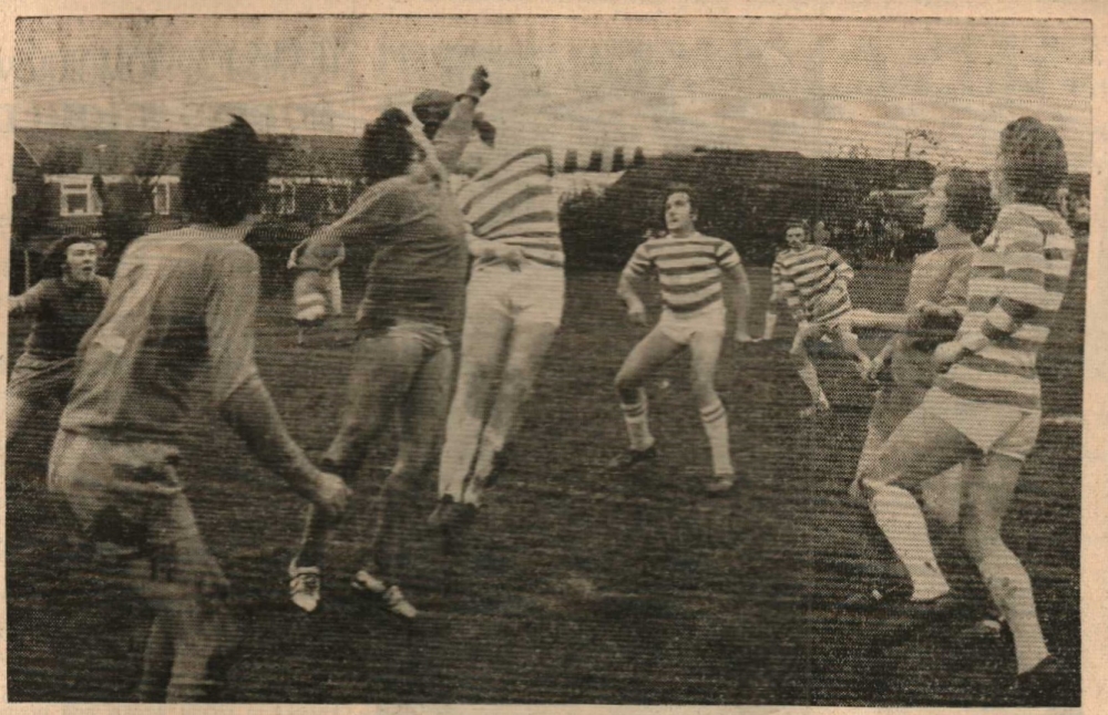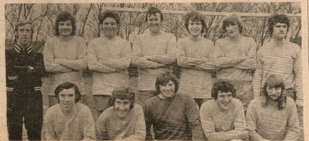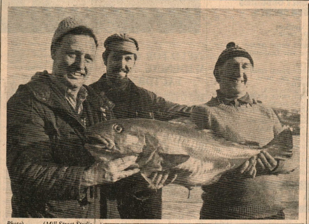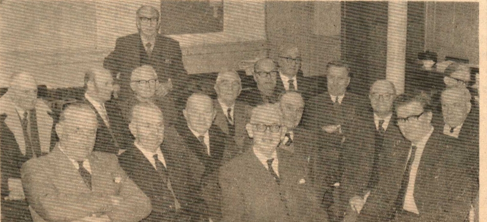 Mr Bill Finn, Gordon Harris, Graham Moore, Mike Harris, Jimmy Harris, Len Daniel, Billy Evans and Roy Drew wait to tuck into a plate of turkey.