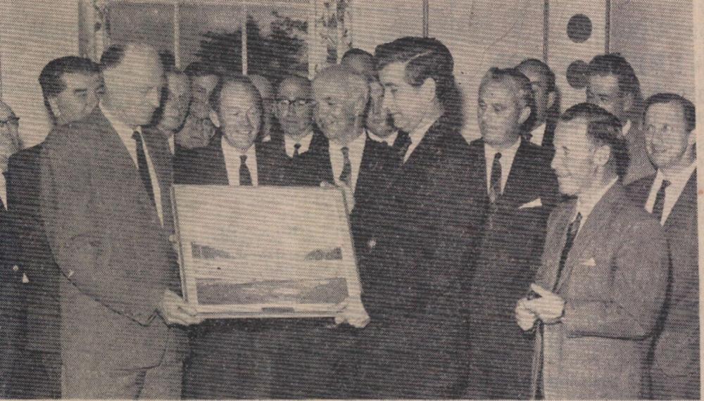 Mr Bill Finn, Gordon Harris, Graham Moore, Mike Harris, Jimmy Harris, Len Daniel, Billy Evans and Roy Drew wait to tuck into a plate of turkey.