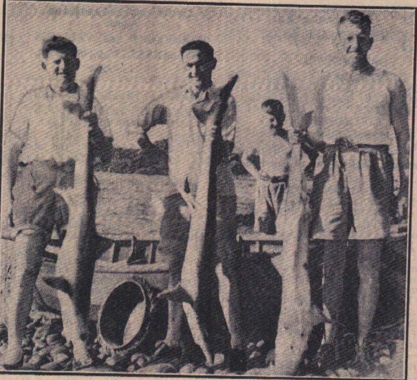 Mr Bill Finn, Gordon Harris, Graham Moore, Mike Harris, Jimmy Harris, Len Daniel, Billy Evans and Roy Drew wait to tuck into a plate of turkey.