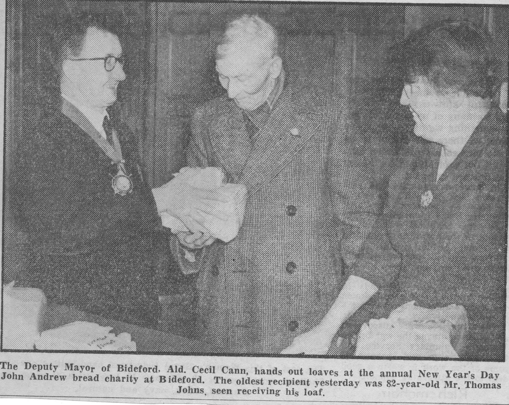 The Deputy Mayor Alderman Cecil Cann hands out a loaf of bread to 82-year-old Mr Thomas Johns