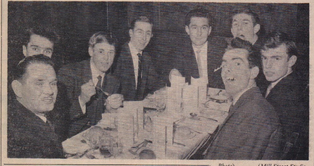 Mr Bill Finn, Gordon Harris, Graham Moore, Mike Harris, Jimmy Harris, Len Daniel, Billy Evans and Roy Drew wait to tuck into a plate of turkey.