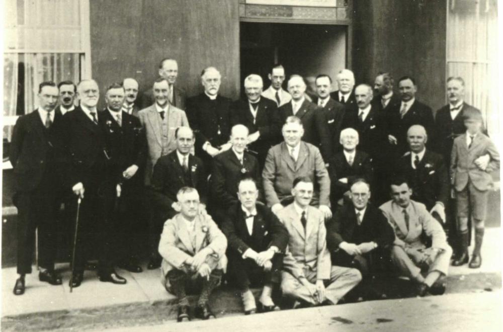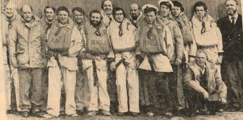 Mr Bill Finn, Gordon Harris, Graham Moore, Mike Harris, Jimmy Harris, Len Daniel, Billy Evans and Roy Drew wait to tuck into a plate of turkey.