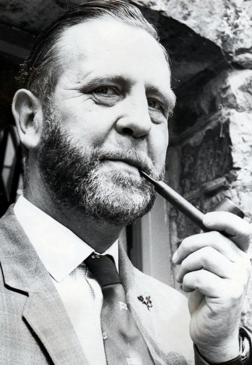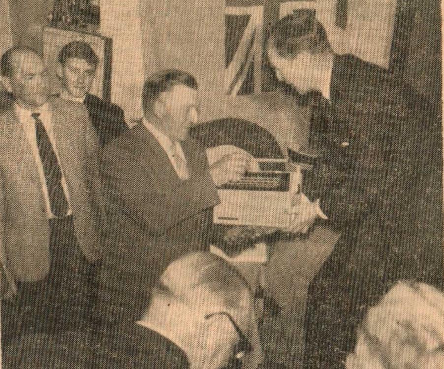 The Deputy Mayor Alderman Cecil Cann hands out a loaf of bread to 82-year-old Mr Thomas Johns