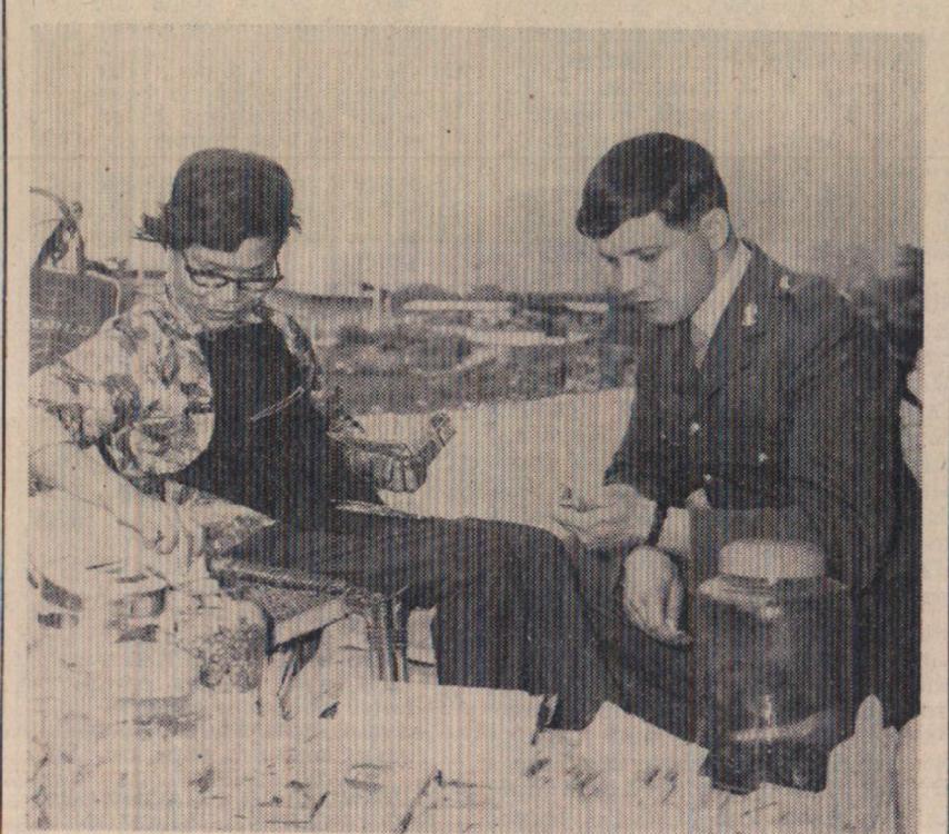 The Deputy Mayor Alderman Cecil Cann hands out a loaf of bread to 82-year-old Mr Thomas Johns