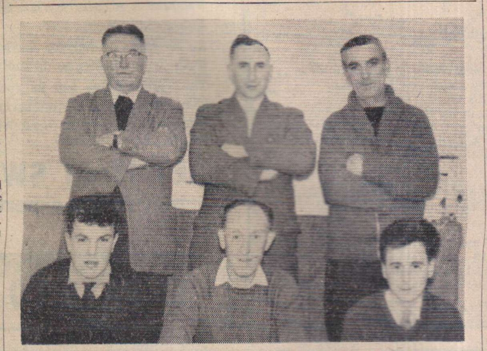 Mr Bill Finn, Gordon Harris, Graham Moore, Mike Harris, Jimmy Harris, Len Daniel, Billy Evans and Roy Drew wait to tuck into a plate of turkey.