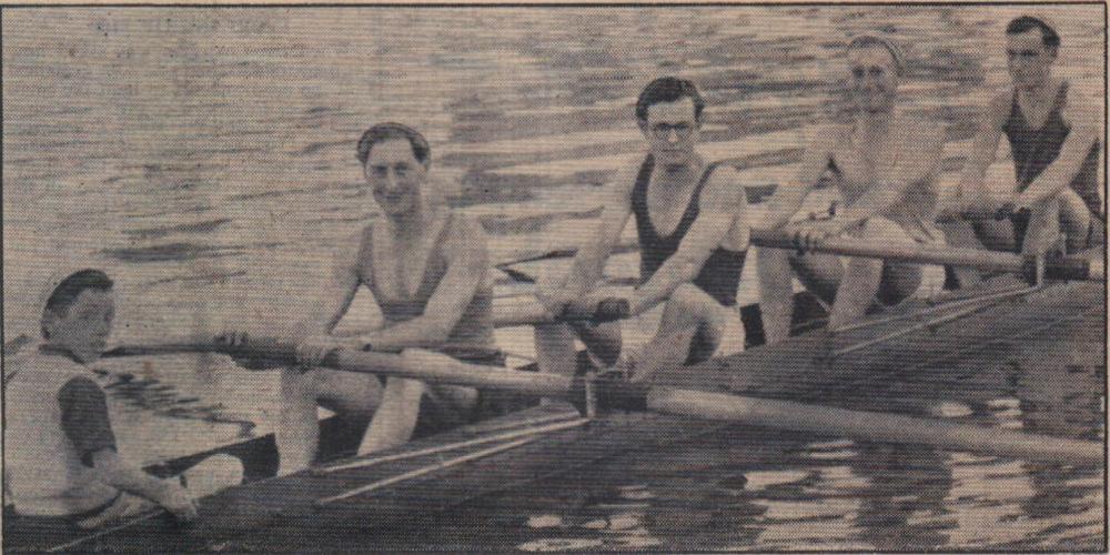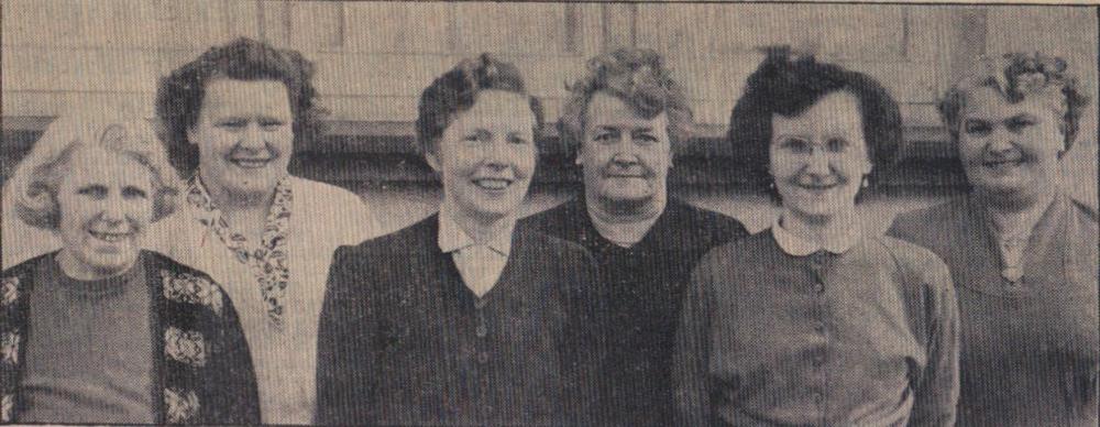 Mr Bill Finn, Gordon Harris, Graham Moore, Mike Harris, Jimmy Harris, Len Daniel, Billy Evans and Roy Drew wait to tuck into a plate of turkey.