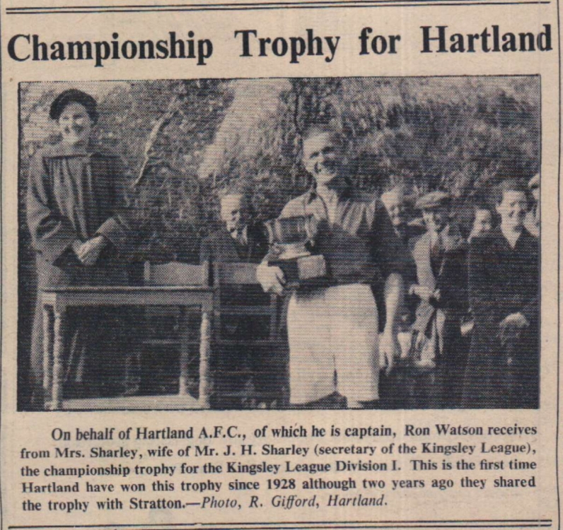 On behalf of Hartland A.F.C., Ron Watson receives the championship trophy for the Kingsley League Division 1.