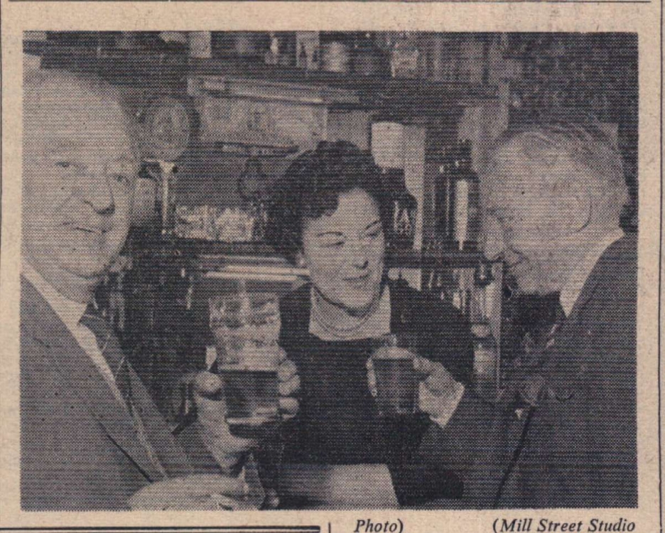 Mr Bill Finn, Gordon Harris, Graham Moore, Mike Harris, Jimmy Harris, Len Daniel, Billy Evans and Roy Drew wait to tuck into a plate of turkey.