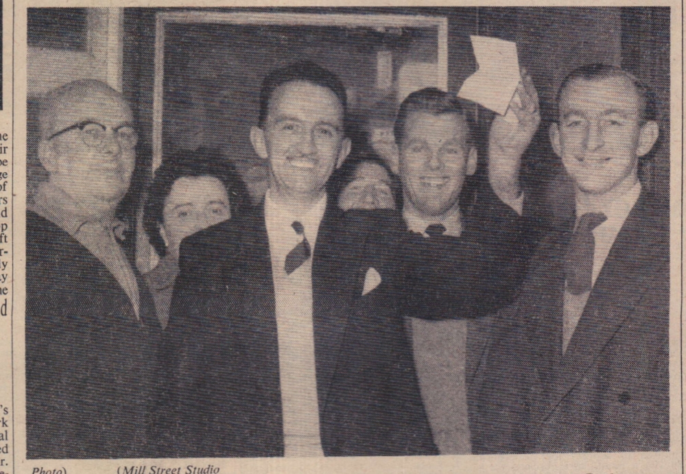 Mr Bill Finn, Gordon Harris, Graham Moore, Mike Harris, Jimmy Harris, Len Daniel, Billy Evans and Roy Drew wait to tuck into a plate of turkey.
