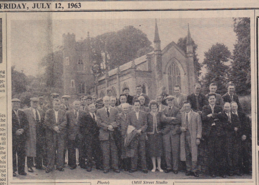 Mr Bill Finn, Gordon Harris, Graham Moore, Mike Harris, Jimmy Harris, Len Daniel, Billy Evans and Roy Drew wait to tuck into a plate of turkey.