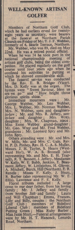 Immediate mourners were: Mr George Webber, Mr Leo Webber, Mrs L Webber, Mr Norman Webber, Mrs N Webber, Mr and Mrs R Jeffery, Mrs Wrey, Mrs W Chapman,