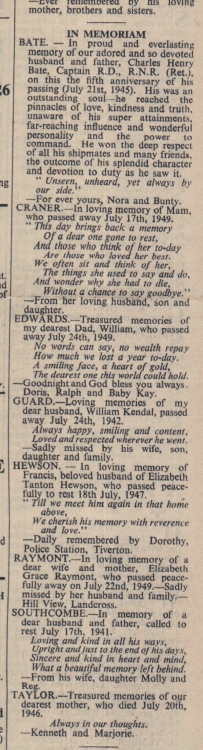 Bate – in proud and everlasting memory of our adored and so devoted husband and father, Charles Henry Bate, Captain RD, RNR, (Ret), on this the fifth anniversary of his passing (July 21st 1945). His was an outstanding soul – he reached the pinnacles of love, kindness and truth, unaware of his super attainments, far-reaching influence and wonderful personality and the power to command. He won the deep respect of all his shipmates and many friends, the outcome of his splendid character and devotion to duty as he saw it. “Unseen, unheard, yet always by our side”. For ever