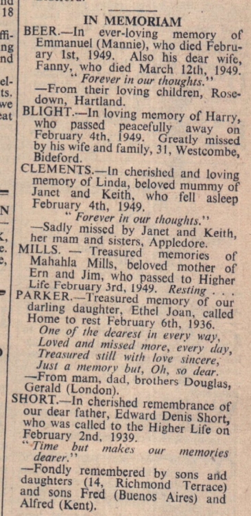 Beer – in ever-loving memory of Emmanuel (Mannie), who died February 1st 1949. Also his dear wife, Fanny, who died March 12th 1949. From their loving children, Rosedown, Hartland.