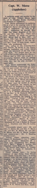 Capt Morse commenced his seafaring life as a lad in the coasting trade in the Bridgewater district and came as a young man to Appledore. In 1896 at St Mary’s, Appledore, he married Miss Ellen Day, eldest daughter of the late Mr and Mrs John Day. There were three children, of whom two survive. Mrs Morse died in May 1907. In March 1908, Capt Morse married Miss Mary Cook, daughter of the late Mr and Mrs Cook,
