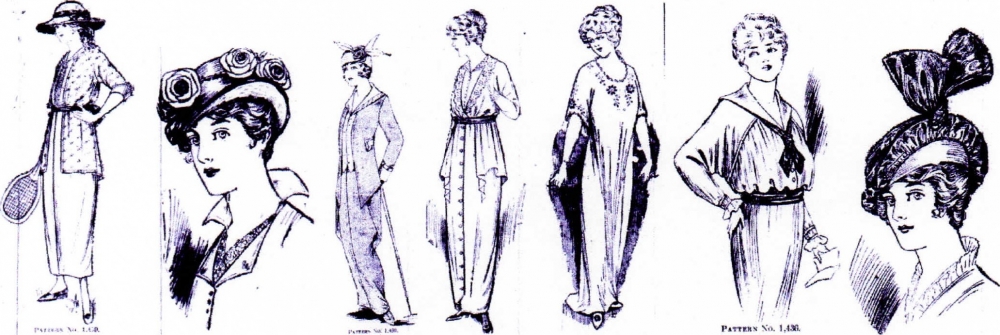 This month we have decided to focus on the perennially popular subject of fashion. The Gazette devoted a column each week to ladies clothing illustrated with drawings of the garments, some of which are shown here. Going by these pictures the women of 1914 seem to have had tiny waists and tall statuesque outlines. Note also one very masculine look!