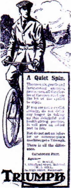There are a number of advertisements for various forms of personal transport. Ford is advertising a 'universal car' from E125. Triumph Motors are not only manufacturing motor cycles but also bicycles under the slogan 'a quiet spin'. Raleigh bicycles can be purchased from E5 19s 6d from G Boyle, High Street, Bideford.