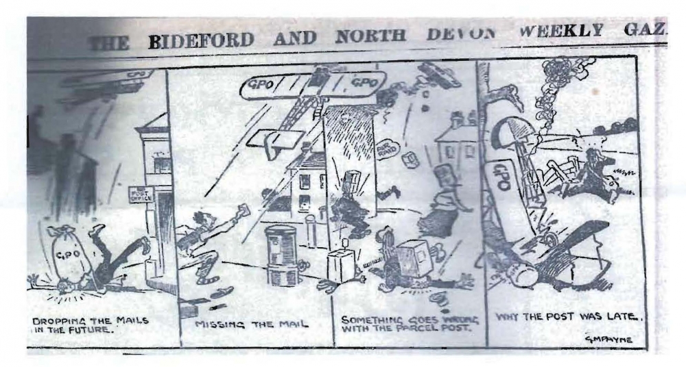 Drawn by Gilbert Morris 'Bertie' Payne who was born in Cardiff in 1897. He was the older brother of A B Payne who created the comic strip 'Pip, Squeak and Wilfred' in the Daily Mirror. His work was extensive between 1900 and the 1920s and he died in Bristol in 1947. It is amusing to compare the notion contained in this cartoon and 100 years later with Amazon experimenting with an online parcel delivery using similar aerial methods.