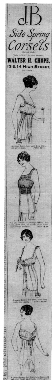 In contrast, on the opposite page, Walter H Chope, 13 & 14 High Street Bideford, have an advert for JB Side-Spring corsets, illustrated by line drawings as reproduced alongside. This advertisement appears in every edition in April and we believe it is the first time that illustrations of this nature have appeared in the paper.It will be several more years before photographs appear.