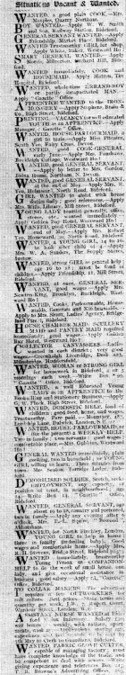 We have reproduced the Situations Vacant & Wanted column which seems to hark back to an earlier age before the War when the wealthier people in society employed chambermaids, housekeepers, cooks and parlourmaids as a matter of course. It is common to see words like “strong girl” or “willing girl” wanted in relation to childcare or heavy domestic duties and housework.