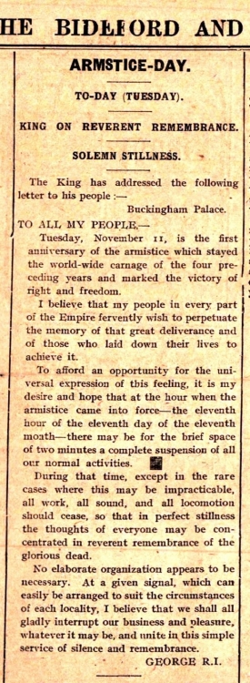 Armistice Day: The paper publishes a letter from the King, which is reproduced below. All school pupils are to be assembled just before 11am for a two minute silence. In Appledore the period of silence and remembrance was observed at schools, shipyards and places of business, the signal being given by a rocket fired on Western Hill.