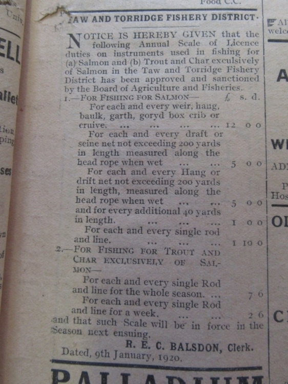 Anybody who might be interested in fishing should read page 5 of the 13th January edition where the Taw & Torridge Fishery licence fees are set out for the year. This includes several methods of catching which have since been banned. The Notice makes interesting reading.