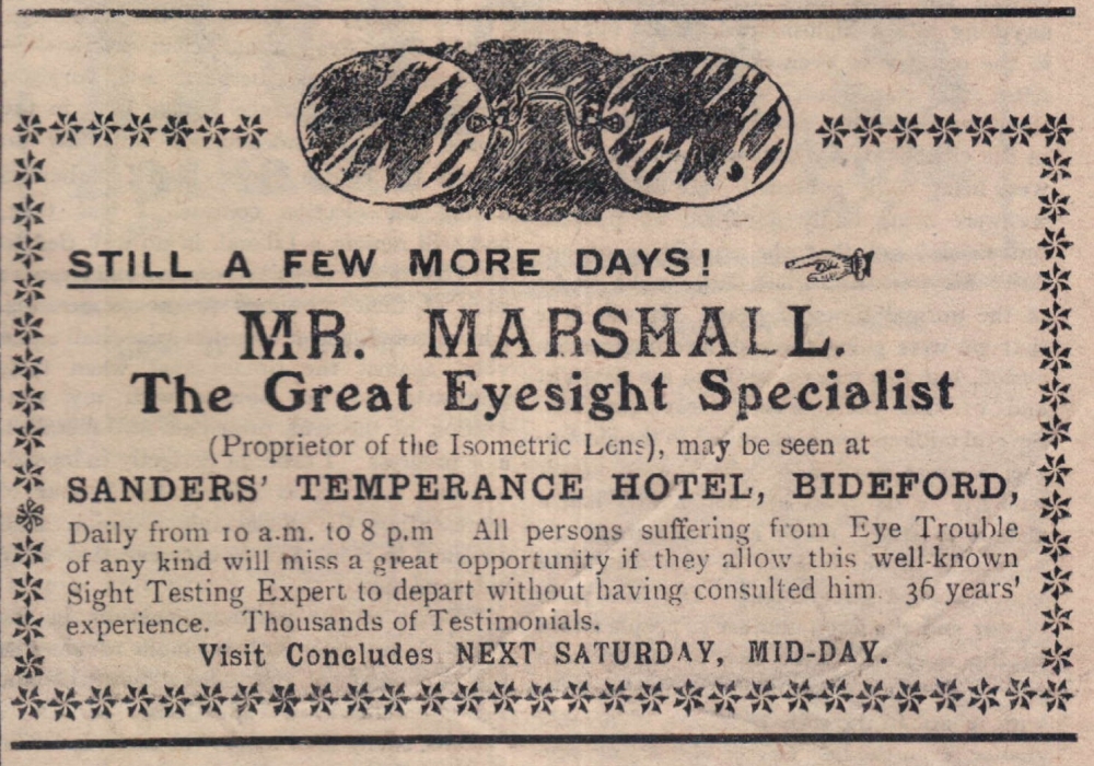 There’s still a few more days to visit Mr Marshall, The Great Eye Specialist, who is at Sanders’ Temperance Hotel, in Bideford. He has 36 years’ experience and thousands of testimonials.
