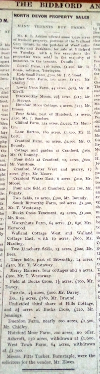 Gorrell Farm, 136 acres, £1400, Mr R Boase, solicitor, Torrington; Hole Small Farm, £700, Mr J C Bond; Higher Venn Farm, 102 acres, £1450, Mr Chidley; Lower Venn Farm, 44 acres, £925, Mr R Kivell; Stroxworthy Moors, 29½ acres, £415 Mr J Stevens; Hutsford Moor Cottage, 2 acres, £275, Mr Prouse; Four fields, part of Hutsford, 31 acres, £250, Mr J Sanders; Clifford Farm, 354 acres, £2525, Mr Hamlyn; Lane Barton, 169 acres, £3500, Mr E Lott; Cranford Farm, 92 acres, £2500, Mr O Boundy; Cottage and garden at Cranford, £260, Mr O Boundy; Four fields at Cranford, 12 acres, £600 Mr Vanstone; Cranford Water West and Quarry, 17 acres, £650, Mr Moore; Cranford Water East, 6 acres, £210, Mr Moore; Four acre field at Cranford, £212 10s, Mr Fogarty; Two Fields, 10acres, £300, Mr Boundy; South Bitworthy Farm, 108 acres, £2300, Mr T Westaway; Bucks Cross Tenament, 25 acres, £1200, Mr Ross; Watershute Farm, 64 acres, £1650, Mrs Heywood; Walland Cottage West and Walland Cottage East with 19 acres, £800, Mr Harding; Two Limebury fields, 13 acres, £600, Mr Beer; Three fields, part of Bitworthy, 14 acres, £450, Mr T Westaway; Merry Harriers, four cottages and 9 acres, £500, Mr T Westaway; Field at Bucks Cross, 1½ acres, £100, Mr Davey; Two fields at Bucks Cross, 2½ acres, £200, Mr Davey; Two fields at Bucks Cross, 1½ acres, £180, Mr Braund; Undivided third share of Hills Cottage and 2½ acres at Bucks Cross, £120, Mr Jennings; Duerdon Farm, nearly 200 acres, £2500, Mr Chidley; Hutsford Moor farm, 200 acres, No offer was made; Ashcroft, 150 acres, withdrawn at £1600; West Town Farm, 64 acres, withdrawn at £1700. Messrs Pitts Tucker, Barnstaple, were the solicitors for the Vendor, Mr Elwes.