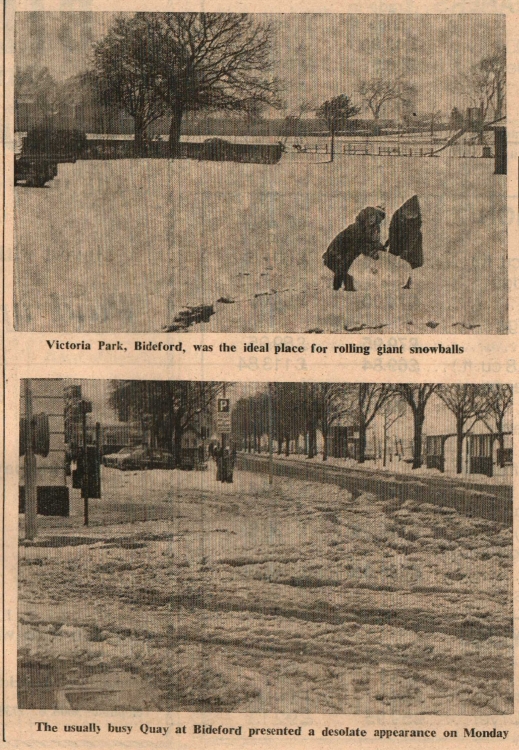 At the peak of the storm, six and a half inches of snow were recorded in the Bideford area. Main problems, however, were caused by strong winds which swept the snow into huge drifts, some more than 20 feet hight, and which cut communications between many villages and towns.
