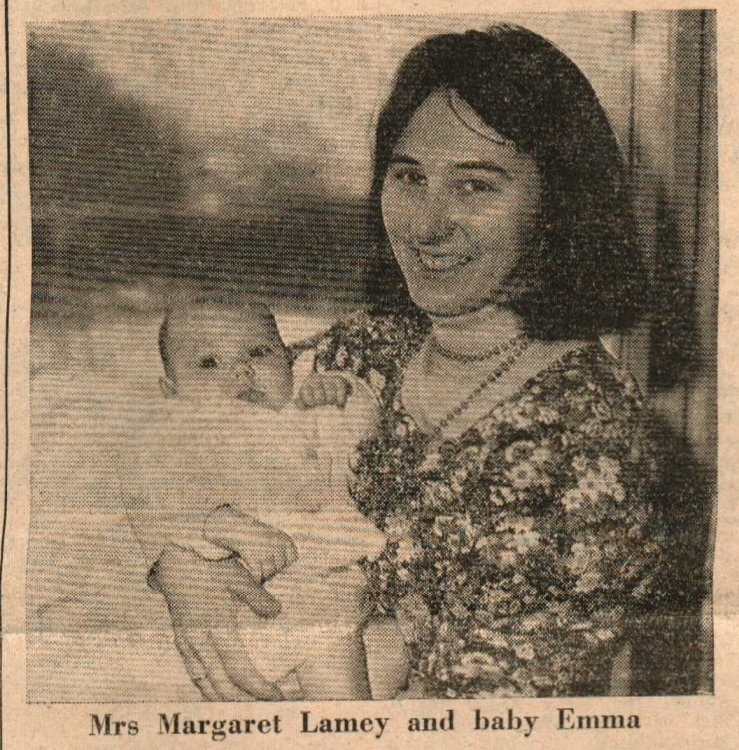 Emma herself will remember none of the details for she is only three months old. She was being taken by her parents, Mr and Mrs Keith Lamey, to visit Keith’s parents, Mr and Mrs Ted Lamey, of Marshwood, Pitt Hill, for the first time when they became victims of the savage weather which hit the Westcountry at the weekend.