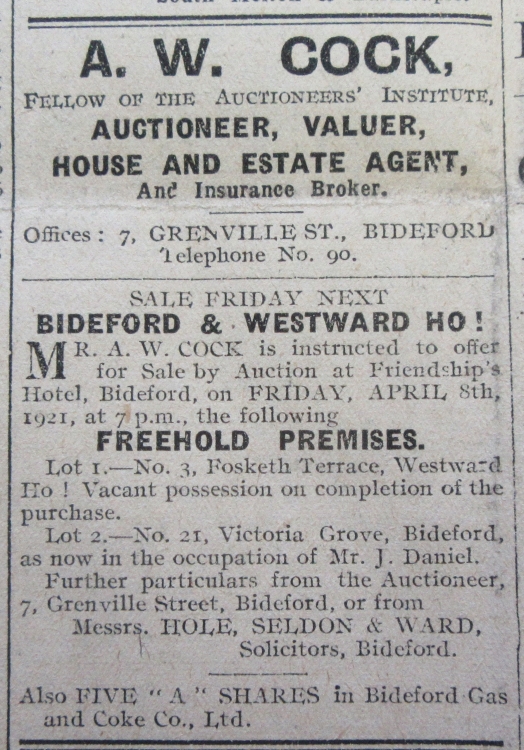 Messrs. A W Cock offer for Auction No 3 Fosketh Terrace, Westward Ho! and No.21 Victoria Grove, Bideford.
