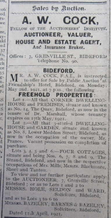 • Lot 1- All that Corner Dwelling house and premises known as 14 The Quay, Bideford, as now in the tenancy of Dr Marshall which expires on 17th May 1921.