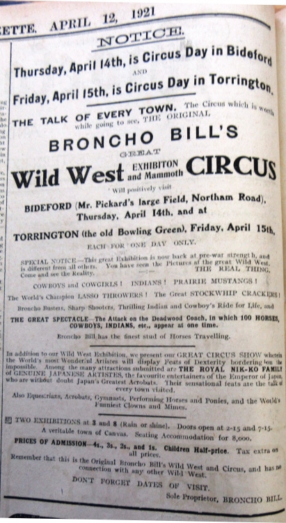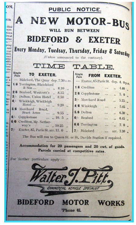 A new bus service between Bideford and Exeter is advertised by Messrs Walter J Pitt. Scheduled to take 3 hours and 30 minutes, this is only an hour longer than today's scheduled bus service. If one takes into account the advances 100 years have made in vehicle technology this was a very quick journey time and the internet tells us that the fare would now equate to over £10.00.