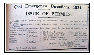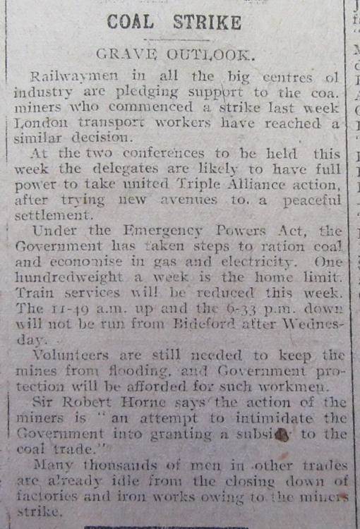 Under the Emergency Powers Act, the Government has taken steps to ration coal and economise on gas and electricity. One hundredweight a week is the home limit. Train services will be reduced this month, some from Bideford onwards to Barnstaple and beyond have been cut altogether.