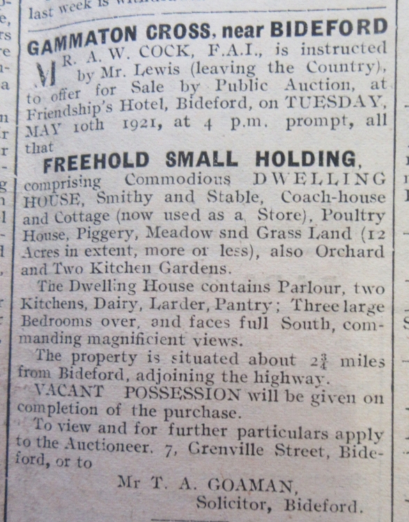 At Gammaton Cross, 2¾ miles from Bideford, adjoining the highway is a Freehold Small Holding consisting of a commodious dwelling house, smithy and stable, coach house and cottage being used as a store, Poultry House , Piggery, Meadow and grass land 12 acres in total also an orchard and two kitchen gardens. All facing south and having commanding views.