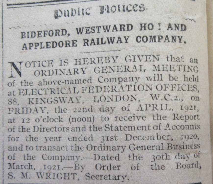 Public Notices. Bideford, Westward Ho! and Appledore Railway Company (despite being closed for several years and no trains running).