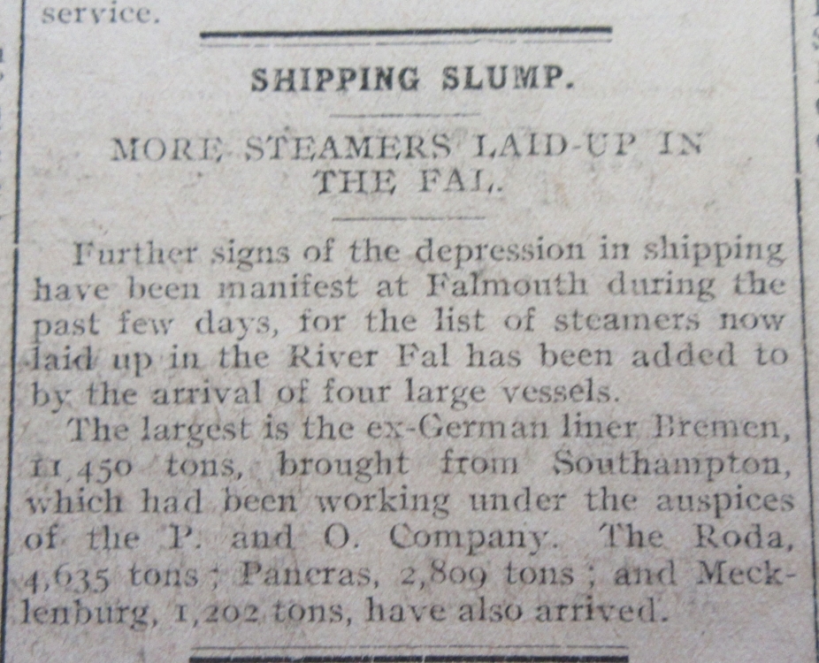 Further signs of the depression in shipping have been seen in Falmouth. The ex-German liner Bremen, brought from Southampton which had been working under the flag of the P&O Company; the Roda; Pancras; and Meckenburg, are berthed in the Fal. In Bideford, three cargo vessels belonging to Messrs Cory Bros of Cardiff were piloted up the river and laid up just below Cross Park on the east bank of the river. The steamers were the Hillhouse, 6000 tons, the Rhio and the Relillio, both of about 4000 tons. At present there are two other vessels of about 6000 tons at the Bideford and Appledore wharves for repair. Messrs Cory Bros have intentions to lay up three other boats on the next spring tide.