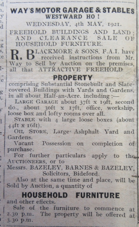 R Blackmore & Sons have received instructions to sell Ways Motor Garage & Stable at Westward Ho! comprising of a substantial stone built and slate covered building and yard with gardens extending to half an acre, large garage 37ft x 19ft, another garage 30ft x 17ft, office workshop, loose box and lofty rooms over, a four horse stable and loose box, an Oil store with large ashphalt yard with gardens. Vacant Possession upon completion.