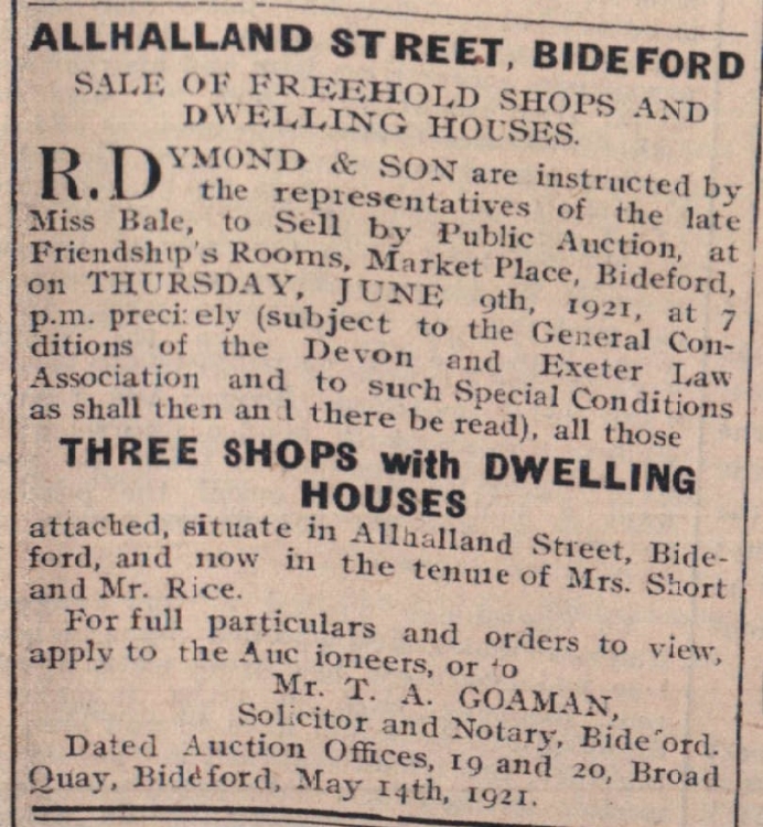 Legal – Summoned for playing football in New Street, two boys were ordered by Bideford Magistrates to pay 1/- each towards costs, and were cautioned as to their future conduct. At Torrington County Petty Sessions, Charles Trigger and John Briglit, both of Dolton, were charged and found guilty of taking certain unseasonable salmon at Brightley Marsh on the river Torridge. They were fined 5s and 10s 6d advocate’s fee. Mr Walter Withecombe, of Apps Farm, Littleham, brought a claim for £10 damages against his neighbour, Mr Wm Jas. Huxtable, of Heale Farm, in respect of a bite by the latter’s black and tan cross-bred sheep dog. In ordinary circumstances the case would be dismissed but the defendant was entitled to his costs. The dog was destroyed, a summons was issued and there would be a judgement for the defendant, with costs. William Brend pleaded guilty to a charge of plying for hire in the Strand with a motor hackney carriage without being licensed for the borough; he was fined 2s 6d.