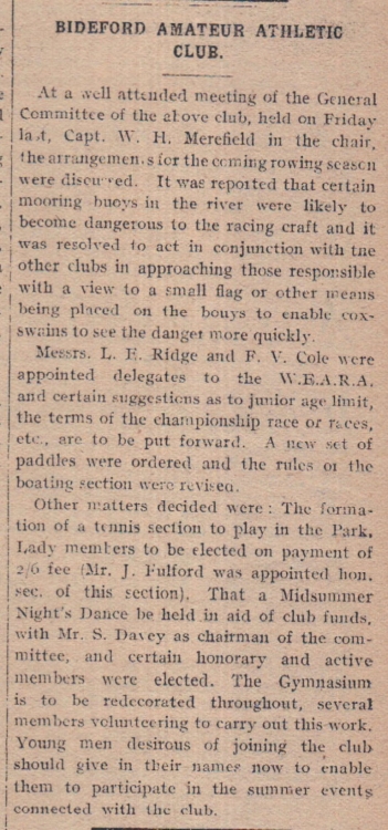 At a well attended meeting of the General Committee of the Bideford Amateur Athletic Club, with Capt W H Merefield in the chair, the arrangements for the coming rowing season were discussed.
