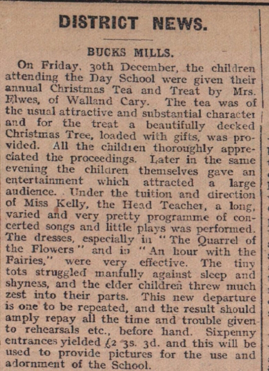Bucks Mills – Mr F Coles organised a very successful entertainment – a concert and dance. The proceeds were handed to the Vicar for the Churchyard Wall Fund. The old and fascinating customs connected with May Day were successfully revived by the new headmistress, and Miss Kelly and her sister are to be thoroughly congratulated on the performance. Winnie Prouse was elected ‘Queen’, being crowned by Mrs Elwes.