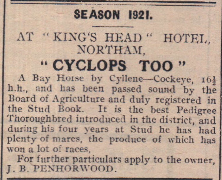 Northam – At the monthly meeting of the Northam Urban District Council, the Medical Officer, Dr E J Toye, reported 8 deaths, 11 births, and that the general health of the district remained satisfactory. In regard to the Coal Emergency Orders, etc. Mr E J Labbett was appointed Coal Officer and he would be able to issue permits to the relevant persons. The Melbury reservoir contains 29 million gallons and, with an indication of dry weather setting in, the public will be asked to be as careful as possible with water supply. Empire Day was celebrated with a service at Northam Cross, the site of the Northam war memorial. At the King’s Head Hotel, a bay horse by Cyllene-Cockeye, ‘Cyclops Too’ will be auctioned.