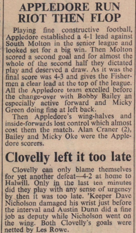 Sport – The first final for the splendid (Capt J H) Reed Cup was played on the ground of the Hansen Recreation Club between Bideford Juniors and Hartland. Goals were scored by Symons, Green and Vodden, with the result Bideford 3, Hartland 0. In the match between Bideford and Barum Town, the home team was unable to field a complete team of its own players and filled their eleven with members of the Athletic Club, and winning by four goals to two.