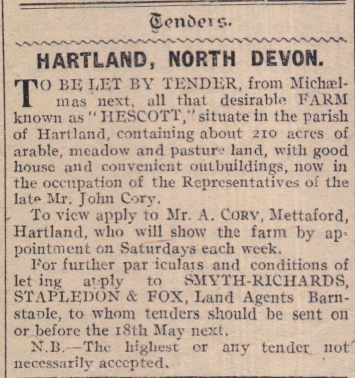 Mr T Bailey, Harbour, has had the misfortune to lose another useful horse. Mr R Pengilly, Summerwell, also lost a valuable colt, whilst Mr Oliver (late of Hennaford) suffered similar misfortune. Ill-luck fell upon Mr Philip Burrow, Bursdon, by the death of a very valuable dairy cow. Prizes were won at the clay pigeon shooting at West Country Inn by Messrs Tom Colwill, F Shaddick and E Colwill.