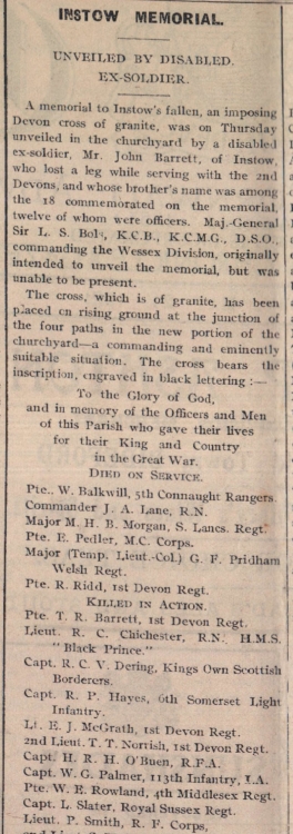 A memorial to Instow’s fallen, an imposing Devon cross of granite, was unveiled by Mr John Barrett, an ex-soldier.