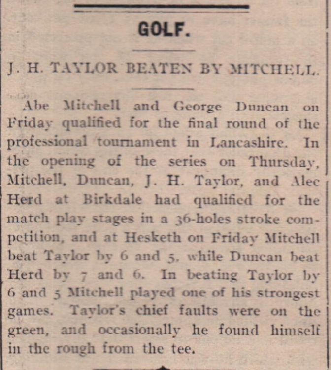 In golf, J H Taylor was beaten by Abe Mitchell at a professional tournament in Lancashire.
