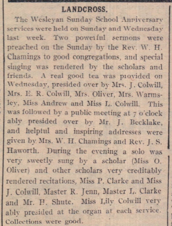 Landcross – The Wesleyan Sunday School Anniversary Services were held and a real good tea was provided by Mrs J Colwill, Mrs E R Colwill, Mrs Oliver, Mrs Warmsley, Miss Andrew and Miss L Colwill.